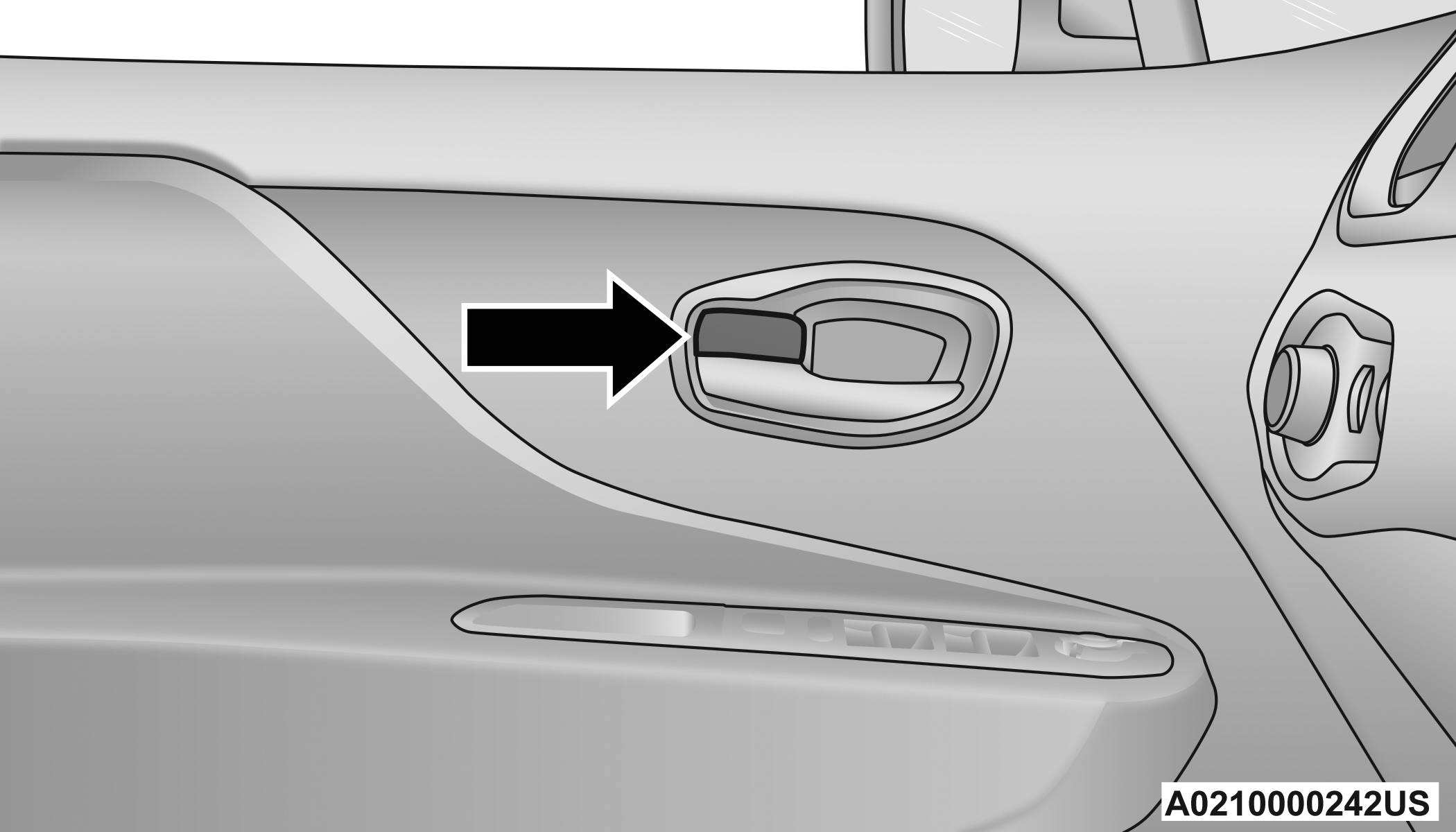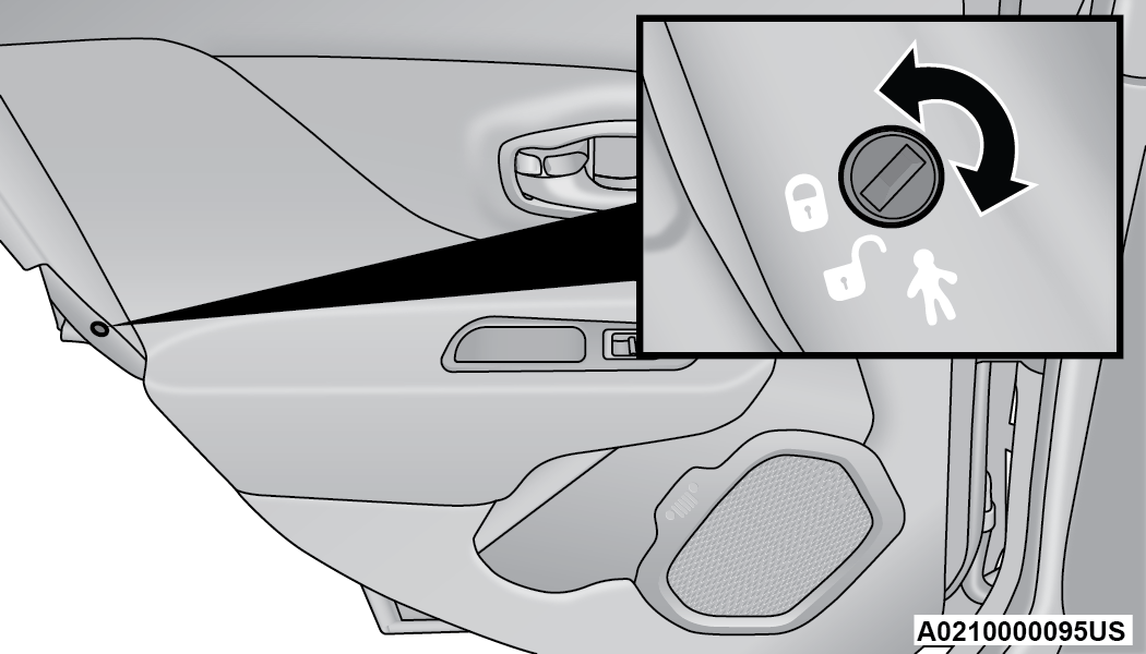 When the Child-Protection Door Lock system is engaged, the door can only be opened by using the outside door handle even though the inside door lock is in the unlocked position.