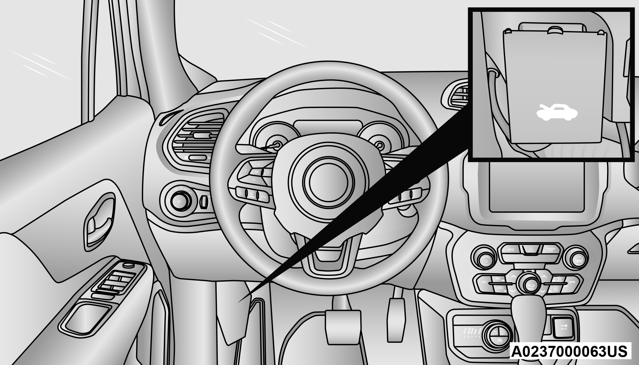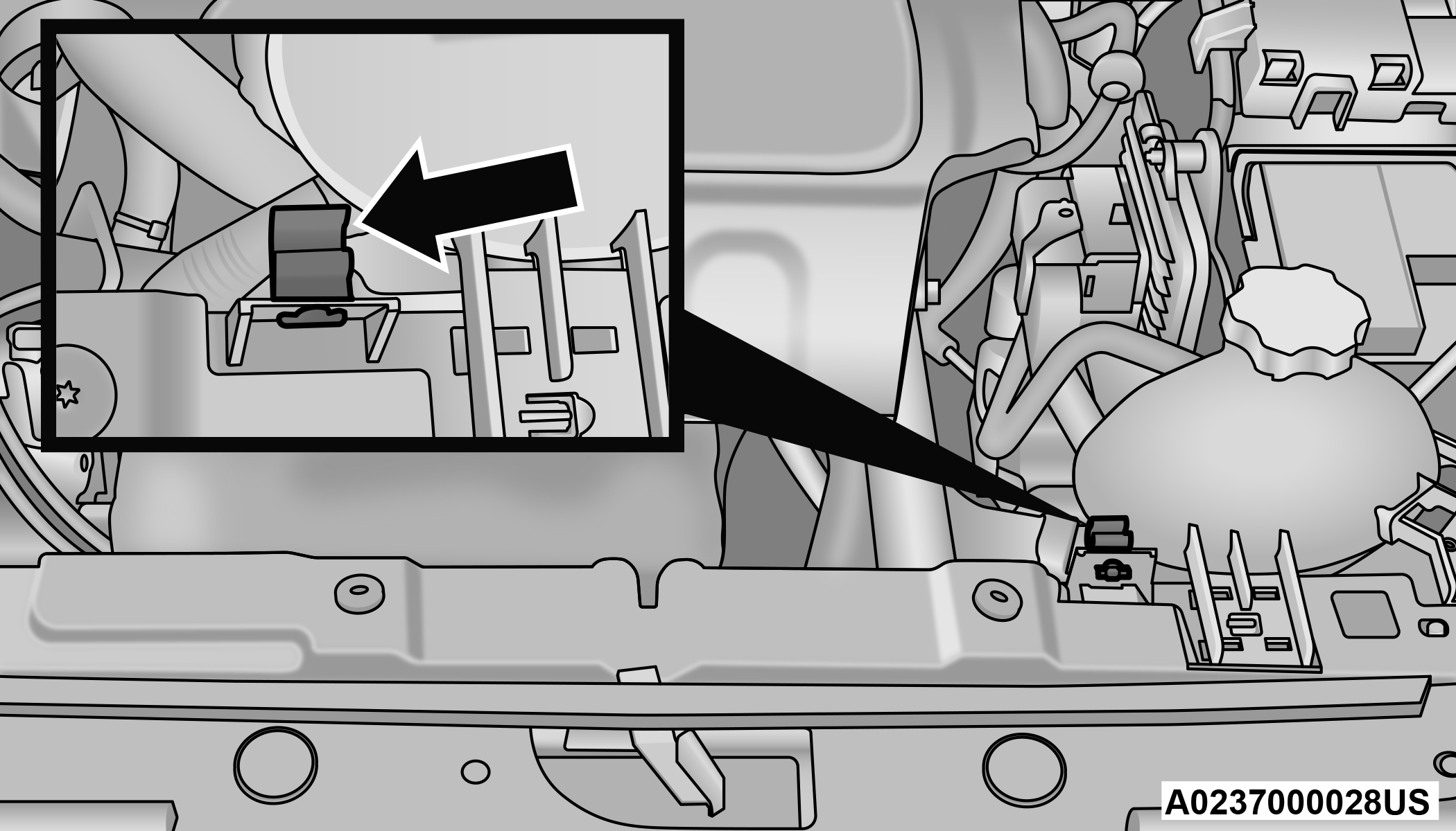 Move to the outside of the vehicle and push the safety latch release lever toward the passenger side of the vehicle. The hood release lever is located behind the center front edge of the hood.