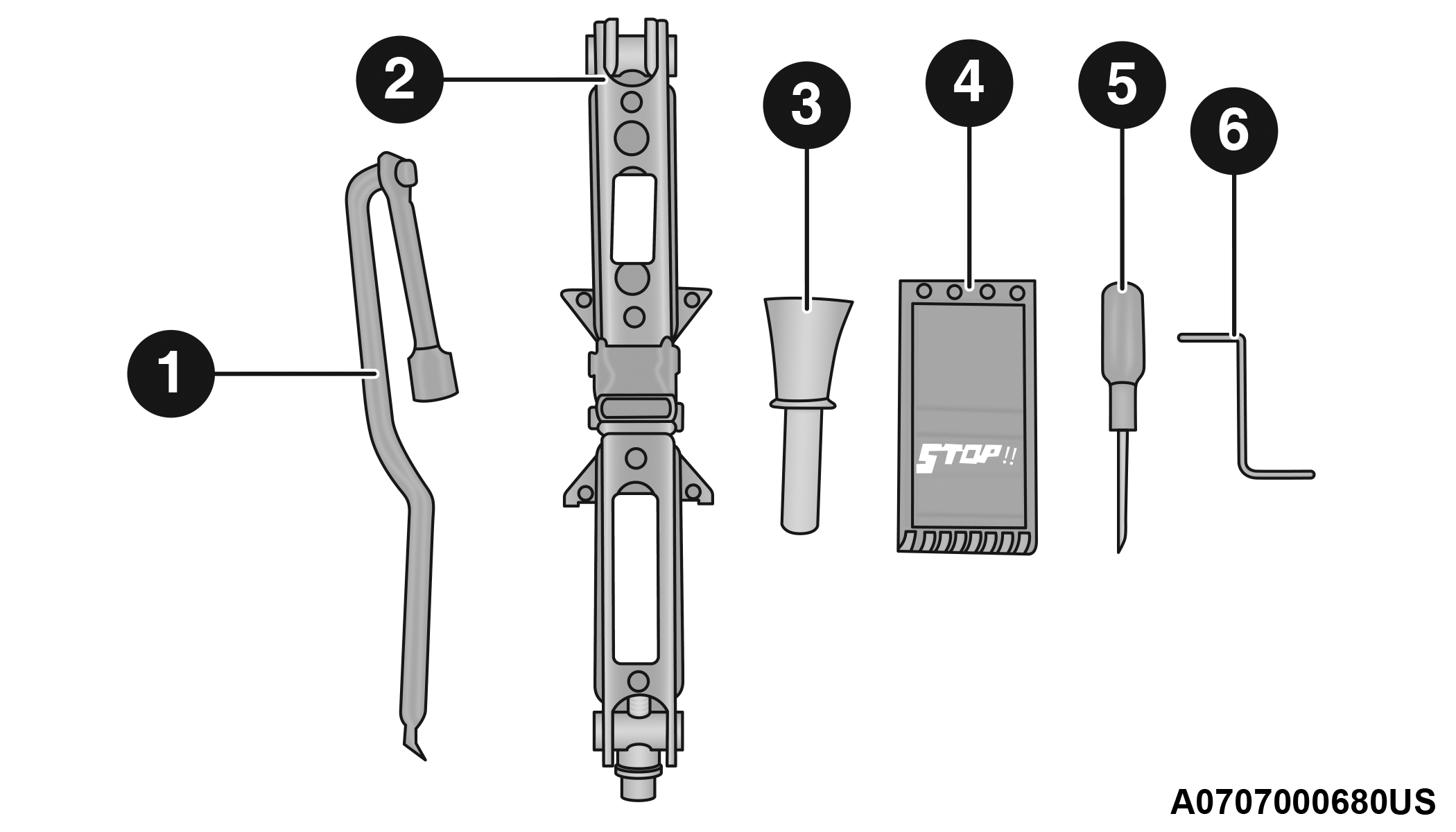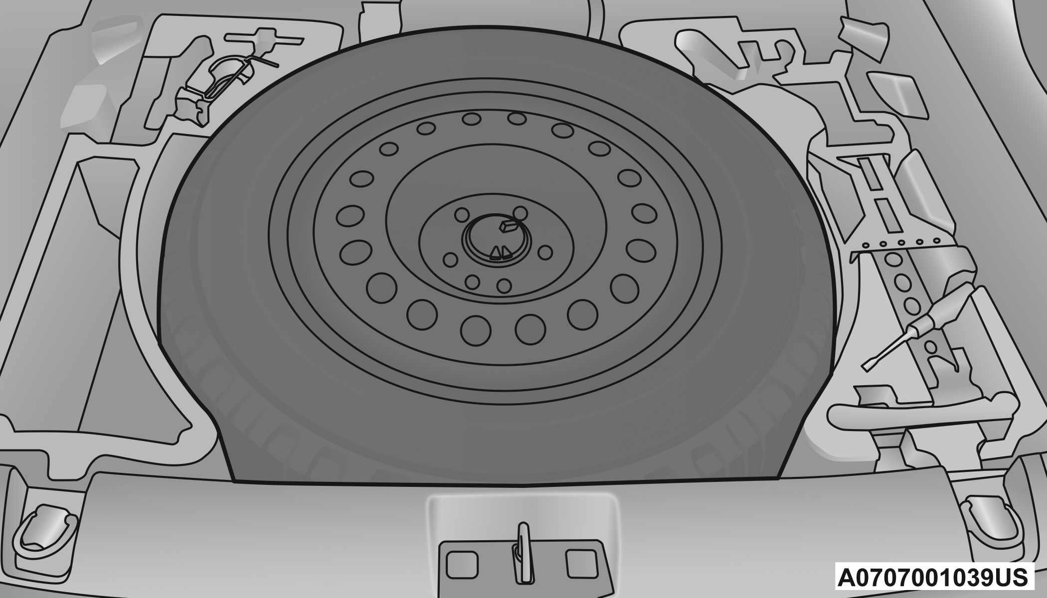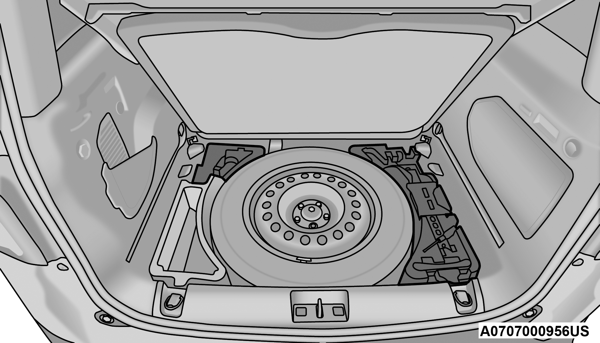 A loose tire or jack thrown forward in a collision or hard stop could endanger the occupants of the vehicle. Always stow the jack parts and the spare tire in the places provided. Have the deflated (flat) tire repaired or replaced immediately.