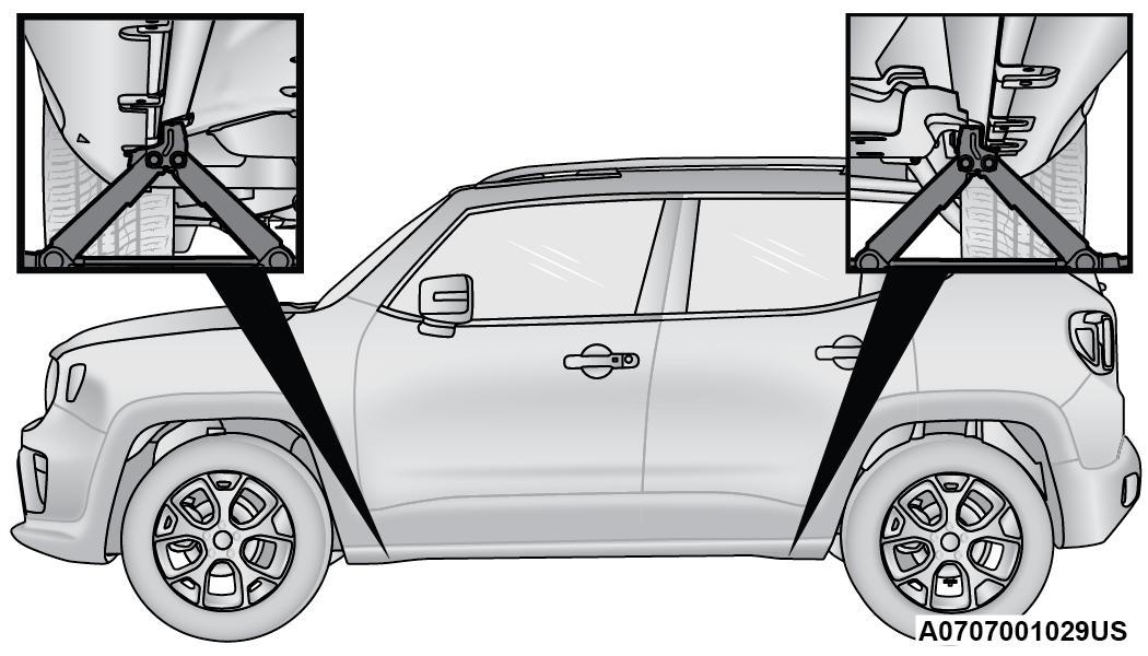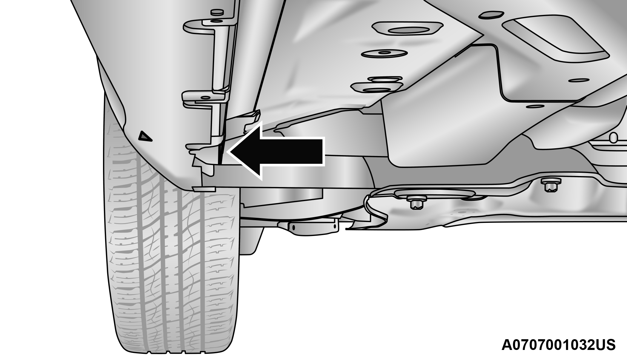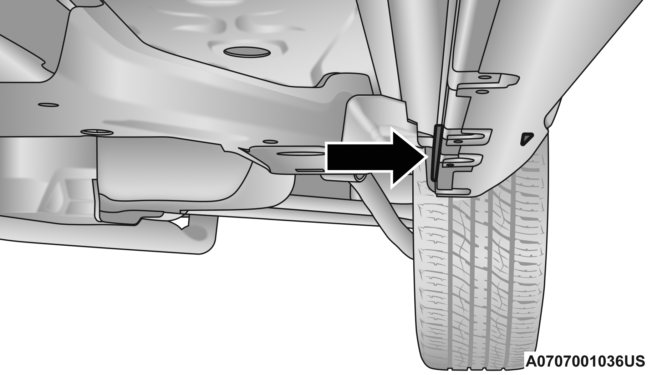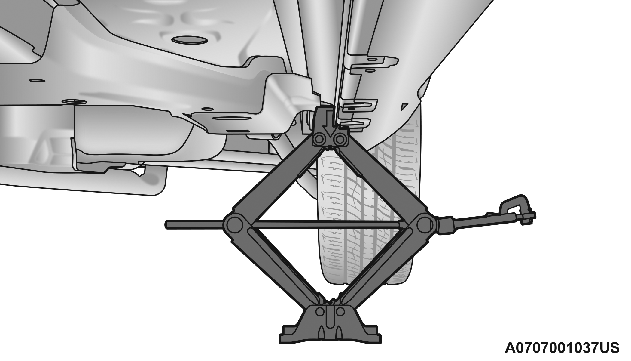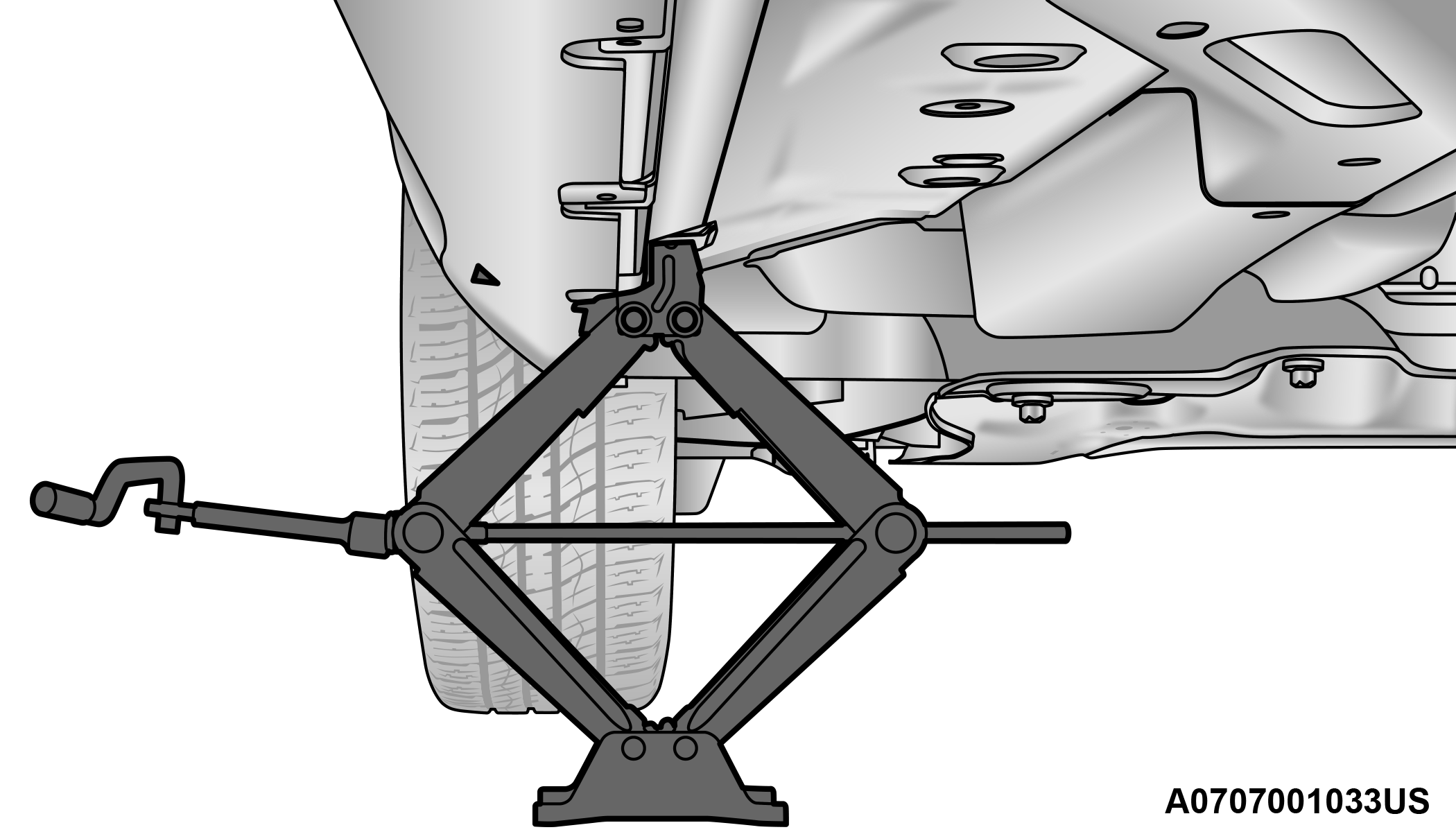 Place the jack underneath the jacking location that is closest to the flat tire. Jacking location is indicated by a stamped arrow on the body. Turn the jack screw clockwise to firmly engage the jack saddle with the lift area of the sill flange, centering the jack saddle inside the cutout in the sill cladding.