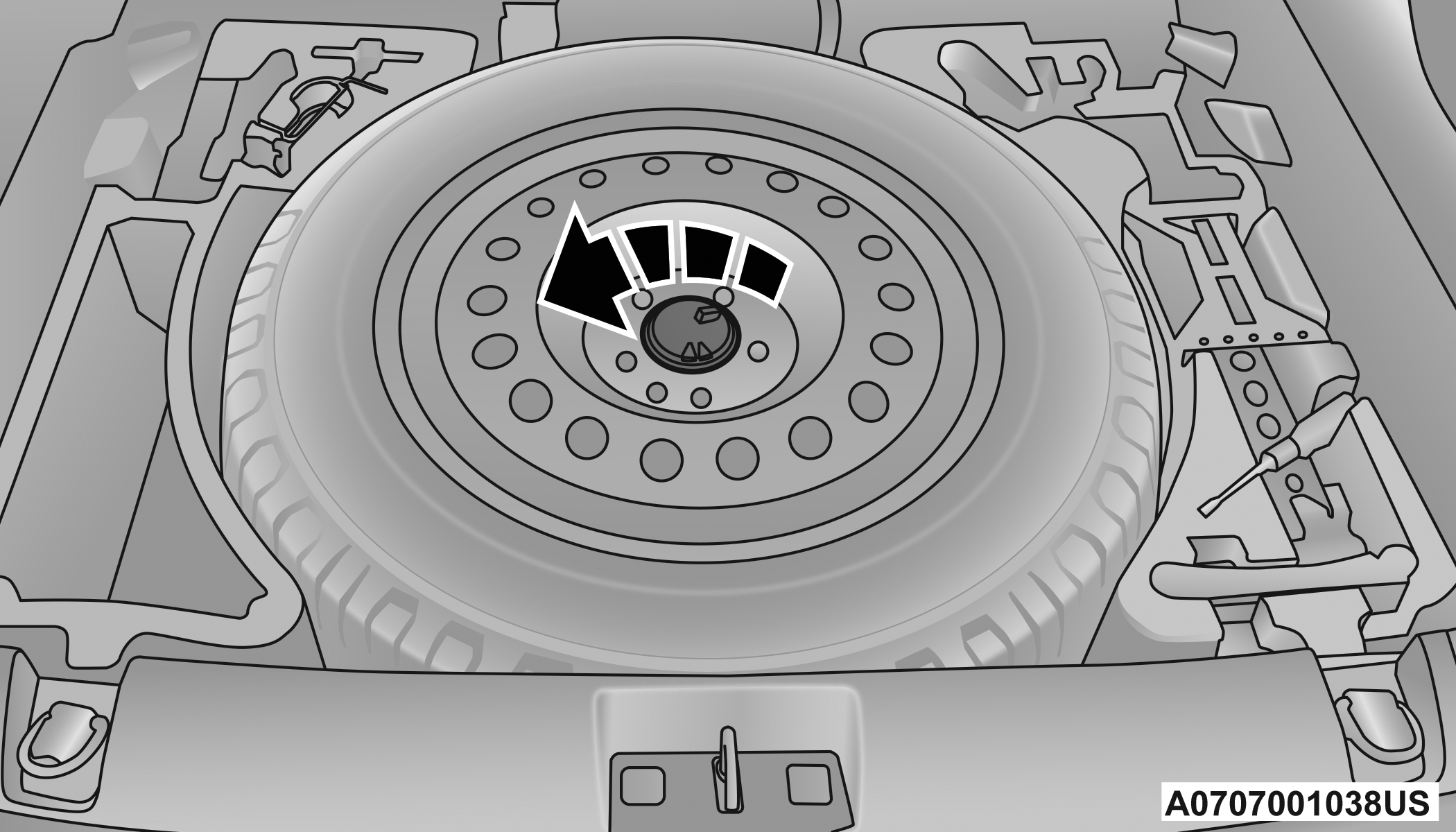 Remove the fastener securing the spare tire by turning it counterclockwise.