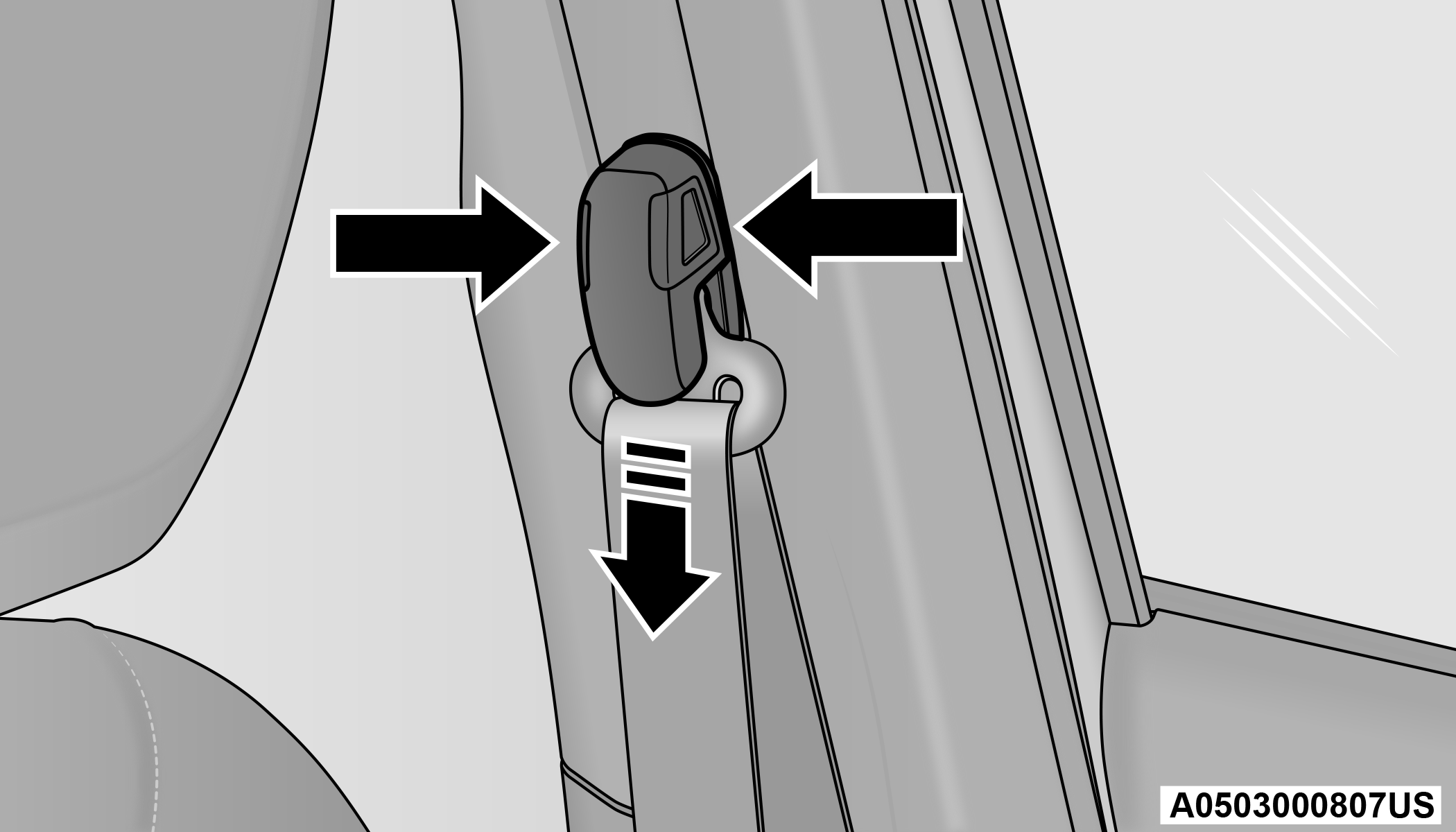 The adjustable upper shoulder belt anchorage is equipped with an Easy Up feature. This feature allows the shoulder belt anchorage to be adjusted in the upward position without pushing or squeezing the release button. To verify the shoulder belt anchorage is latched, pull downward on the shoulder belt anchorage until it is locked into position.