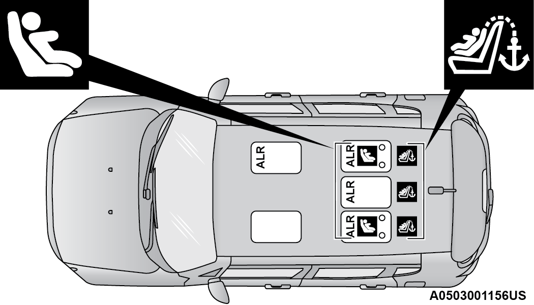 The seat belts in the passenger seating positions are equipped with a Switchable Automatic Locking Retractor (ALR) which is used to secure a child restraint system. The figure below illustrates the locking feature for each seating position. For more information, see .