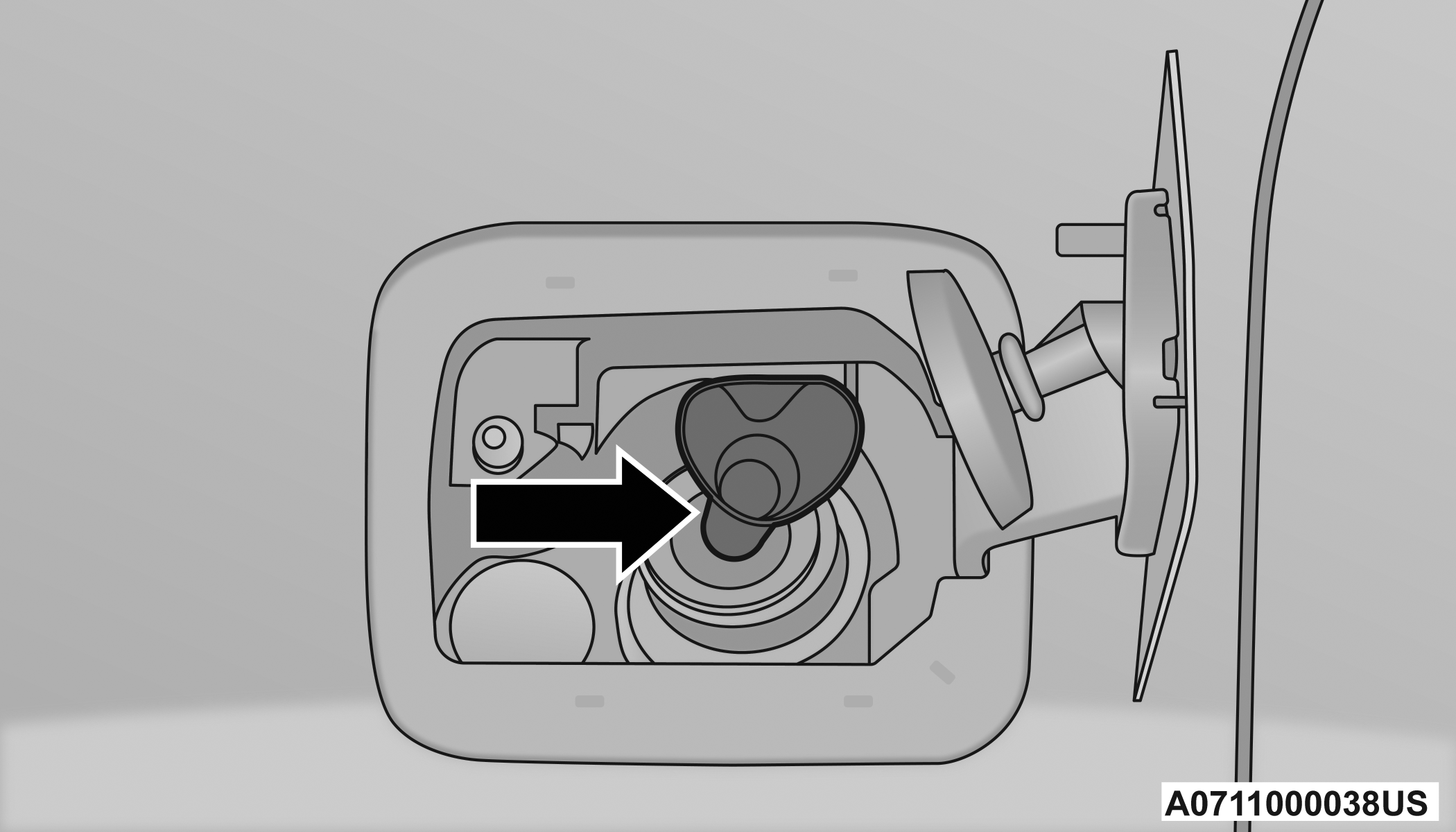 The vehicle is equipped with a refueling funnel for a Cap-Less Fuel System. If refueling is necessary, while using an approved gas can, insert the refueling funnel into the filler neck opening. Take care to open both flappers with the funnel to avoid spills.