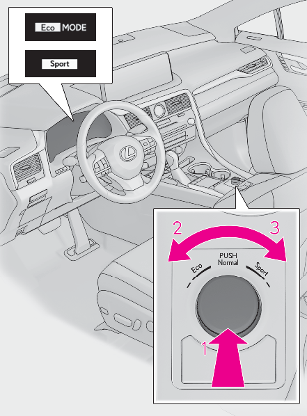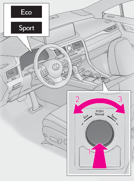 Normal modeProvides an optimal balance of fuel economy, quietness, and dynamic performance. Suitable for city driving.Press the switch to change the driving mode to normal mode when Eco drive mode or sport mode is selected.Eco drive modeHelps the driver accelerate in an eco-friendly manner and improve fuel economy through moderate throttle characteristics and by controlling the operation of the air conditioning system (heating/cooling).When not in Eco drive mode, if the driving mode select switch is turned to the left, the Eco drive mode indicator will come on.Sport modeControls the transmission and engine to provide quick, powerful acceleration. This mode also changes the steering feel, making it suitable for when agile driving response is desired, such as when driving on roads with many curves.When not in sport mode, if the driving mode select switch is turned to the right, the “ Sport” indicator will comes on.F SPORT models (vehicles with Adaptive Variable Suspension System)