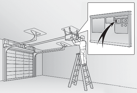 Programming a device other than an entry gate (for U.S.A. owners)Press and hold the handheld transmitter button until the HomeLink® indicator light changes from slowly flashing orange to rapidly flashing green (rolling code) or continuously lit green (fixed code), then release the button.Programming an entry gate (for U.S.A. owners)/Programming a device in the Canadian marketPress and release the remote control transmitter button at 2 second intervals, repeatedly, until the HomeLink® indicator light changes from slowly flashing (orange) to rapidly flashing (green) (rolling code) or continuously lit (green) (fixed code).Test the HomeLink® operation by pressing the newly programmed button and observing the indicator light:Indicator light illuminates: Programming of a fixed code device has completed. The garage door or other device should operate when a HomeLink® button is pressed and released.Indicator light flashes rapidly: The garage door opener motor or other device is equipped with a rolling code. To complete programming, firmly press and hold the HomeLink® button for 2 seconds then release it.If the garage door or other device does not operate, proceed to “Programming a rolling code system”.Repeat the steps above to program another device for any of the remaining HomeLink® buttons.PROGRAMMING A ROLLING CODE SYSTEM2 or more people may be necessary to complete rolling code programming.Locate the “ Learn” or “ Smart” button on the garage door opener motor in the garage.This button can usually be found where the hanging antenna wire is attached to the unit. The name and color of the button may vary by manufacturer. Refer to the owner’s manual supplied with the garage door opener motor for details.