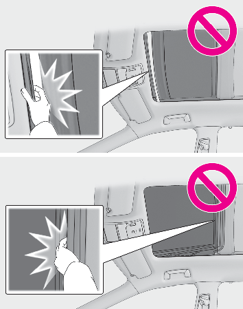 When using the wireless remote control or mechanical key and operating the panoramic moon roof, operate the panoramic moon roof after checking to make sure that there is no possibility of any passenger having any of their body parts caught in the panoramic moon roof. Also, do not let a child operate panoramic moon roof by the wireless remote control or mechanical key. It is possible for children and other passengers to get caught in the panoramic moon roof.When exiting the vehicle, turn the engine switch off, carry the key and exit the vehicle along with the child. There may be accidental operation, due to mischief, etc., that may possibly lead to an accident.Jam protection functionNever use any part of your body to intentionally activate the jam protection function.The jam protection function may not work if something gets caught just before the panoramic moon roof or electronic sunshade is fully closed. Also, the jam protection function is not designed to operate while the switch is being pressed. Take care so that your fingers, etc. do not get caught.To prevent burns or injuriesDo not touch the area between the underside of the panoramic moon roof and the electronic sunshade. Your hand may get caught and you could injure yourself. Also, if the vehicle is left in direct sunlight for a long time, the underside of the panoramic moon roof could become very hot and could cause burns.NOTICE:To prevent damage to the panoramic moon roofBefore opening the panoramic moon roof, make sure that there are no foreign objects, such as stones or ice, around the opening.Do not hit the surface or edge of the panoramic moon roof with hard objects.Do not continuously press the switch after the panoramic moon roof has been fully opened or closed.After the vehicle has been washed or rained onBefore opening the panoramic moon roof, wipe any water off the panoramic moon roof. Otherwise, water may enter the cabin when the panoramic moon roof is opened.