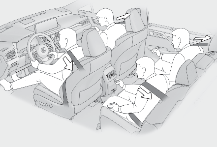 The pretensioners help the seat belts to quickly restrain the occupants by retracting the seat belts when the vehicle is subjected to certain types of severe frontal or side collision or a vehicle rollover.The pretensioners do not activate in the event of a minor frontal impact, a minor side impact or a rear impact.Note:Replacing the belt after the pretensioner has been activatedIf the vehicle is involved in multiple collisions, the pretensioner will activate for the first collision, but will not activate for the second or subsequent collisions.WARNING:Seat belt pretensionersObserve the following precautions to reduce the risk of injury in the event of sudden braking, sudden swerving or an accident.Failure to do so may cause death or serious injury.Do not place anything, such as a cushion, on the front passenger’s seat. Doing so will disperse the passenger’s weight, which prevents the sensor from detecting the passenger’s weight properly. As a result, the seat belt pretensioner for the front passenger’s seat may not activate in the event of a collision.If the pretensioner has activated, the SRS warning light will come on. In that case, the seat belt cannot be used again and must be replaced at your Lexus dealer.