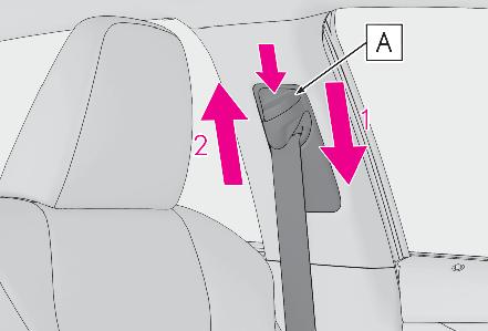 Push the seat belt shoulder anchor down while pressing the release button .Push the seat belt shoulder anchor up while pressing the release button .Move the height adjuster up and down as needed until you hear a click.WARNING:Adjustable shoulder anchorAlways make sure the shoulder belt is positioned across the center of your shoulder. The belt should be kept away from your neck, but not falling off your shoulder. Failure to do so could reduce the amount of protection in an accident and cause death or serious injuries in the event of a sudden stop, sudden swerve or accident.SEAT BELT PRETENSIONERS (FRONT SEATS AND OUTBOARD SECOND-ROW SEATS)