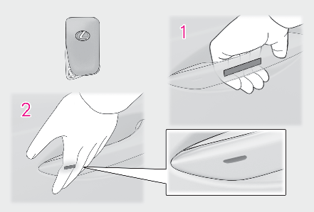 Grip the driver’s door handle to unlock the door. Grip any passenger door handle to unlock all the doors.*Make sure to touch the sensor on the back of the handle.The doors cannot be unlocked for 3 seconds after the doors are locked.*The door unlock settings can be changed.Touch the lock sensor (indentation on the surface of the door handle) to lock all the doors.Check that the door is securely locked.WIRELESS REMOTE CONTROL