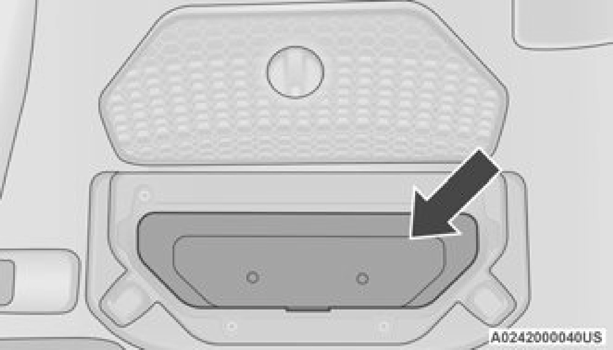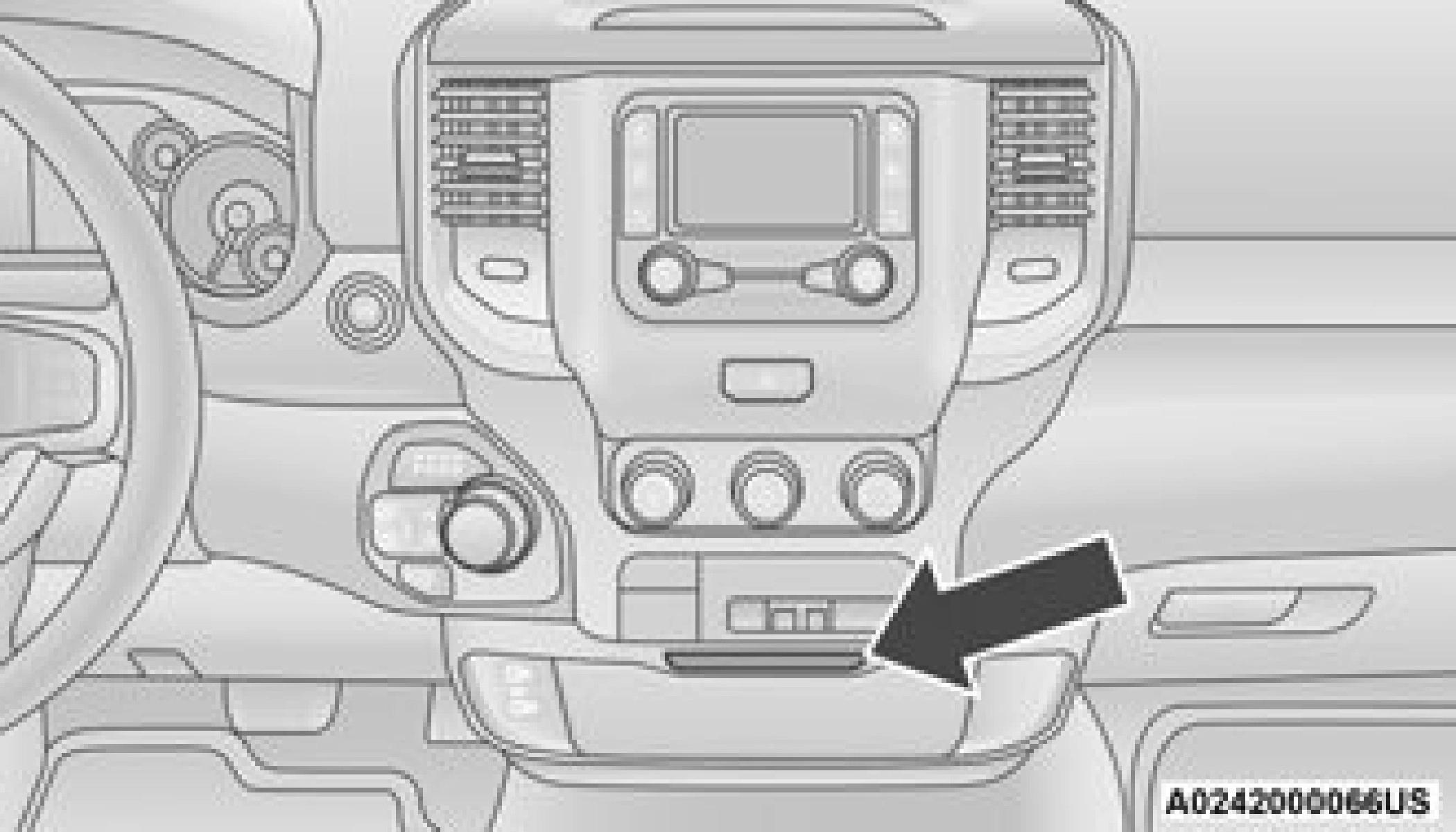 There is a storage drawer located in the lower center of the instrument panel. It can be released by pushing the access button above it. Pull drawer outward to the fully open position.