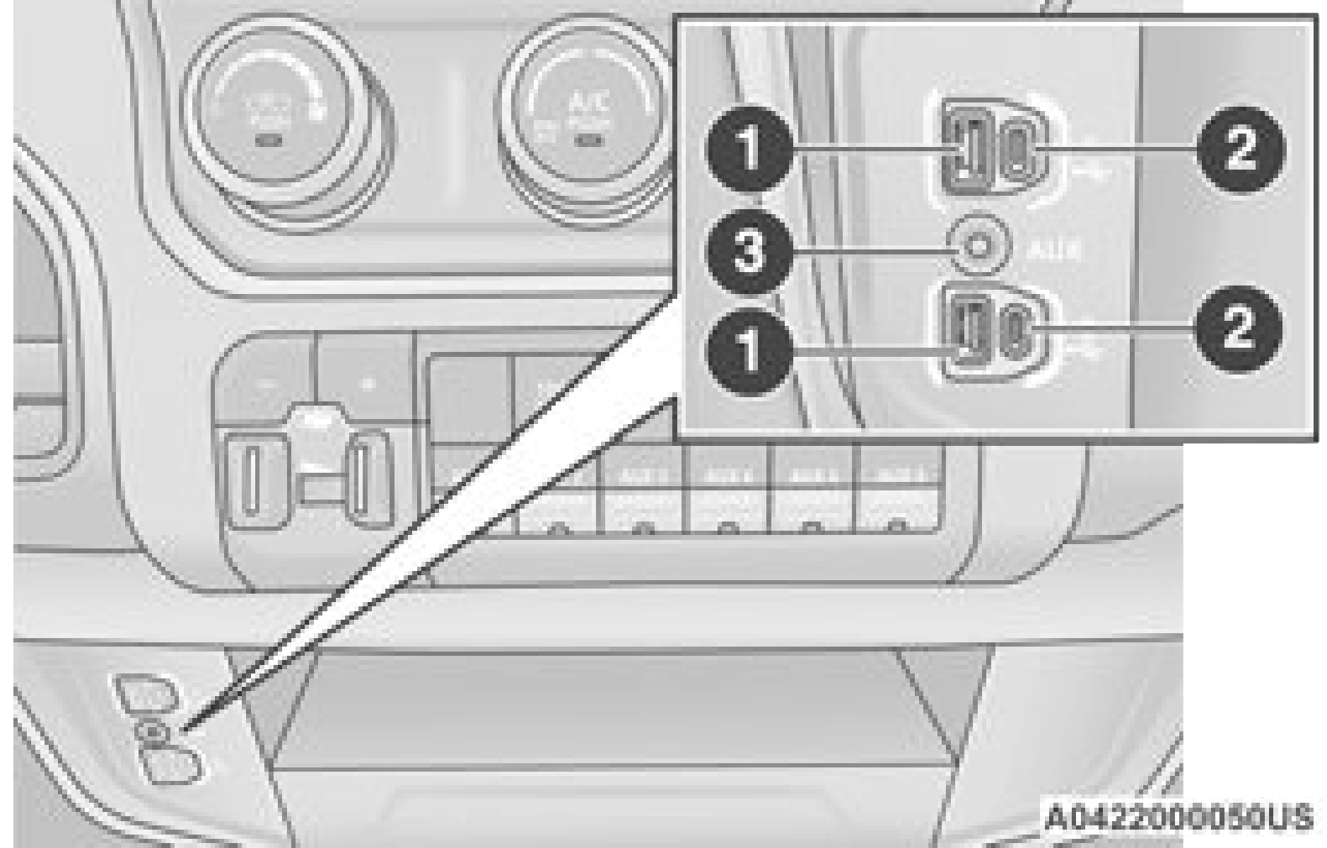 Located on the center stack, just below the instrument panel, is the main media hub. There are four total USB ports: Two Mini-USBs (Type C) and two Standard USBs (Type A). There is also an AUX port located in the middle of the USB Ports.
