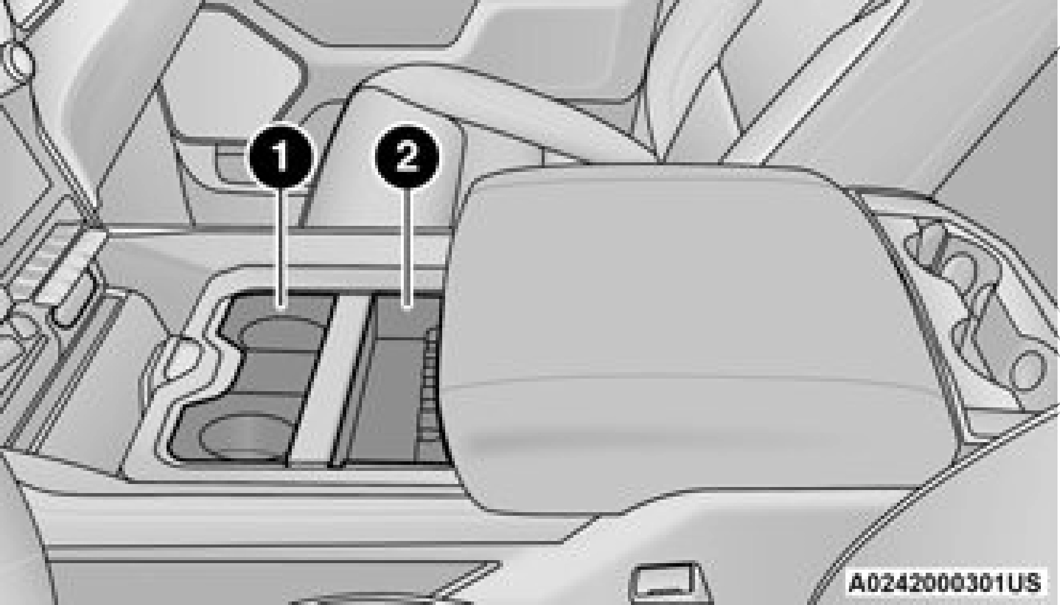 The center storage compartment is located between the driver and passenger seats. The storage compartment provides an armrest and contains both an upper and lower storage area.