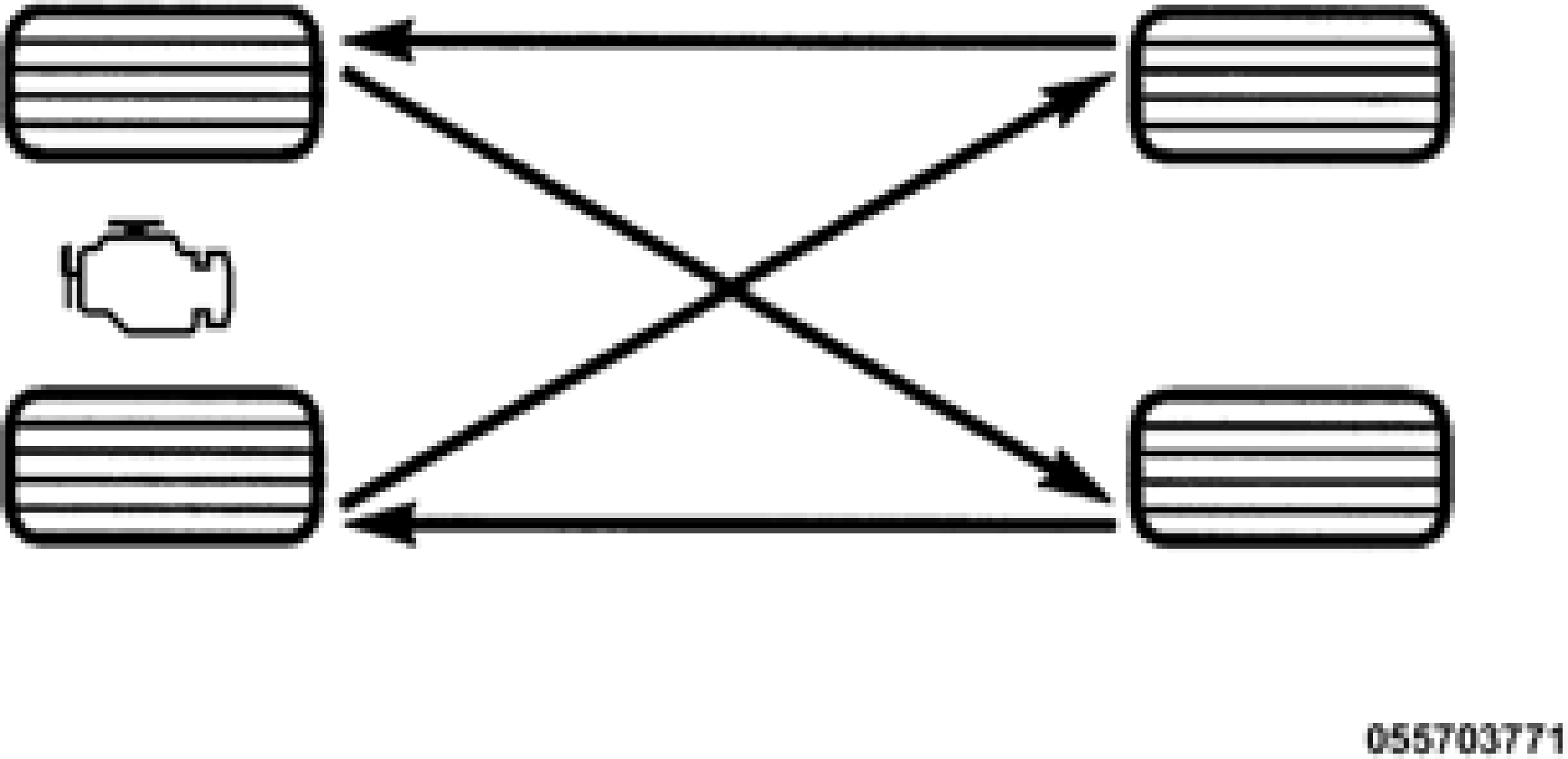 The suggested rotation method is the “rearward cross” shown in the following diagram. This rotation pattern does not apply to some directional tires that must not be reversed.