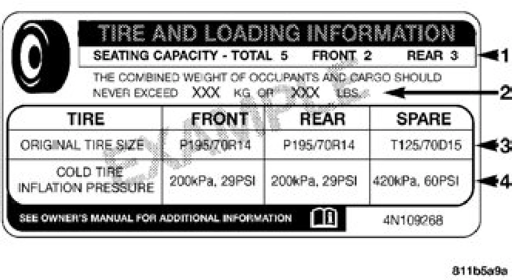A label permanently attached to the vehicle describing the vehicle’s loading capacity, the original equipment tire sizes and the recommended cold tire inflation pressures. |