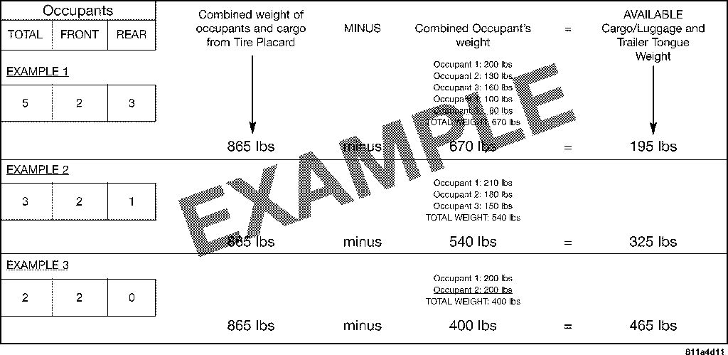 To determine the maximum loading conditions of your vehicle, locate the statement “The combined weight of occupants and cargo should never exceed XXX kg or XXX lbs” on the Tire and Loading Information placard. The combined weight of occupants, cargo/luggage and trailer tongue weight (if applicable) should never exceed the weight referenced here.