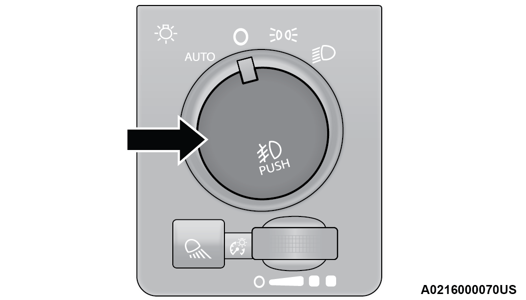 The fog lights are turned on by rotating the headlight switch to the parking light or headlight position and pushing in the headlight rotary control.