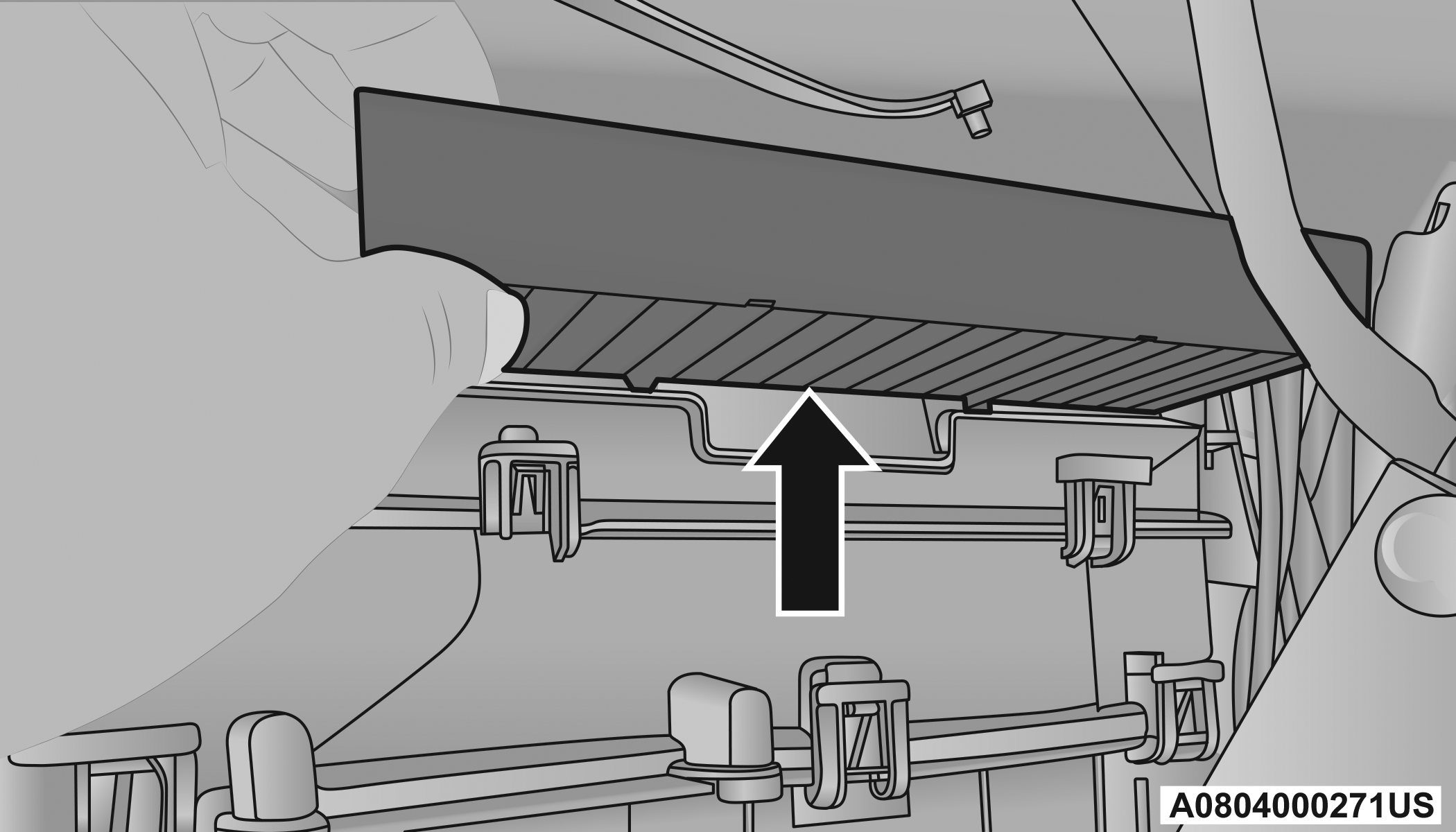 Remove the six plastic push-in fasteners that secure the upper radiator seal to the grille support and both fender ledges.