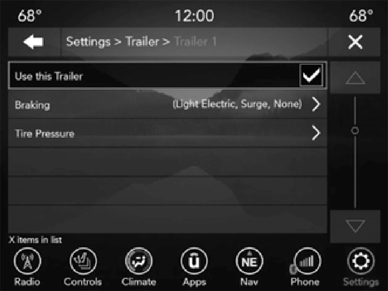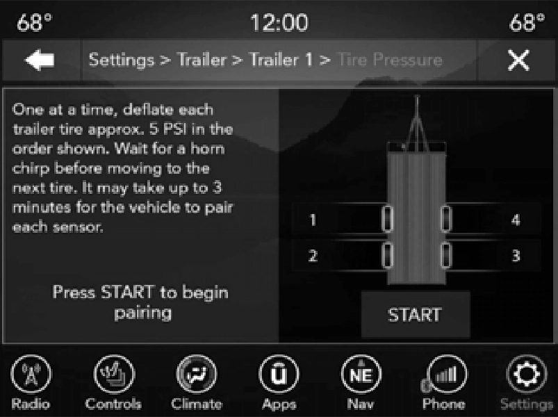 With the sensors installed and the trailer near or connected to your Ram truck, initiate the pairing process by entering the settings menu in the radio and selecting trailer. Select the desired trailer profile to pair to, open the “Tire Pressure” menu, and hit “Setup All Tires” page 258.