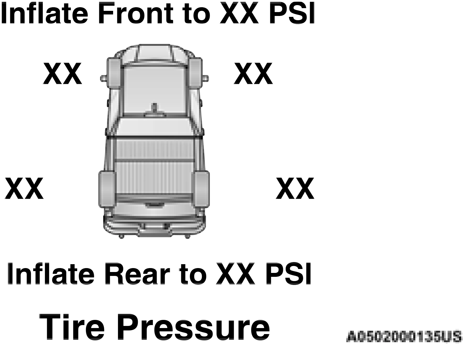 In the Selectable Tire Fill Alert application, which is located in the apps menu of the Uconnect system, the customer will be able to select a pressure setting for both the front and rear axle tire pressures by scrolling through a pressure range from XX to 15 psi in 1 psi increments for each axle setting. XX = the vehicle’s cold placard pressure values for the front and rear axles as shown on the vehicle placard pressure label.
