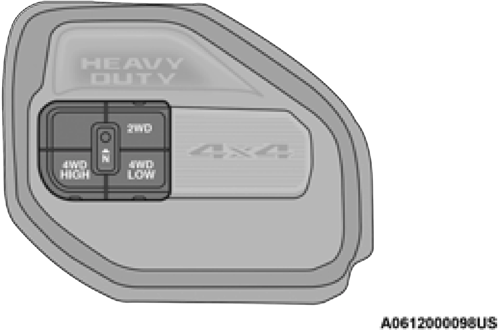 The transfer case NEUTRAL button is located on the lower left hand corner of the 4WD Control Switch. The transfer case NEUTRAL position is to be used for recreational towing only