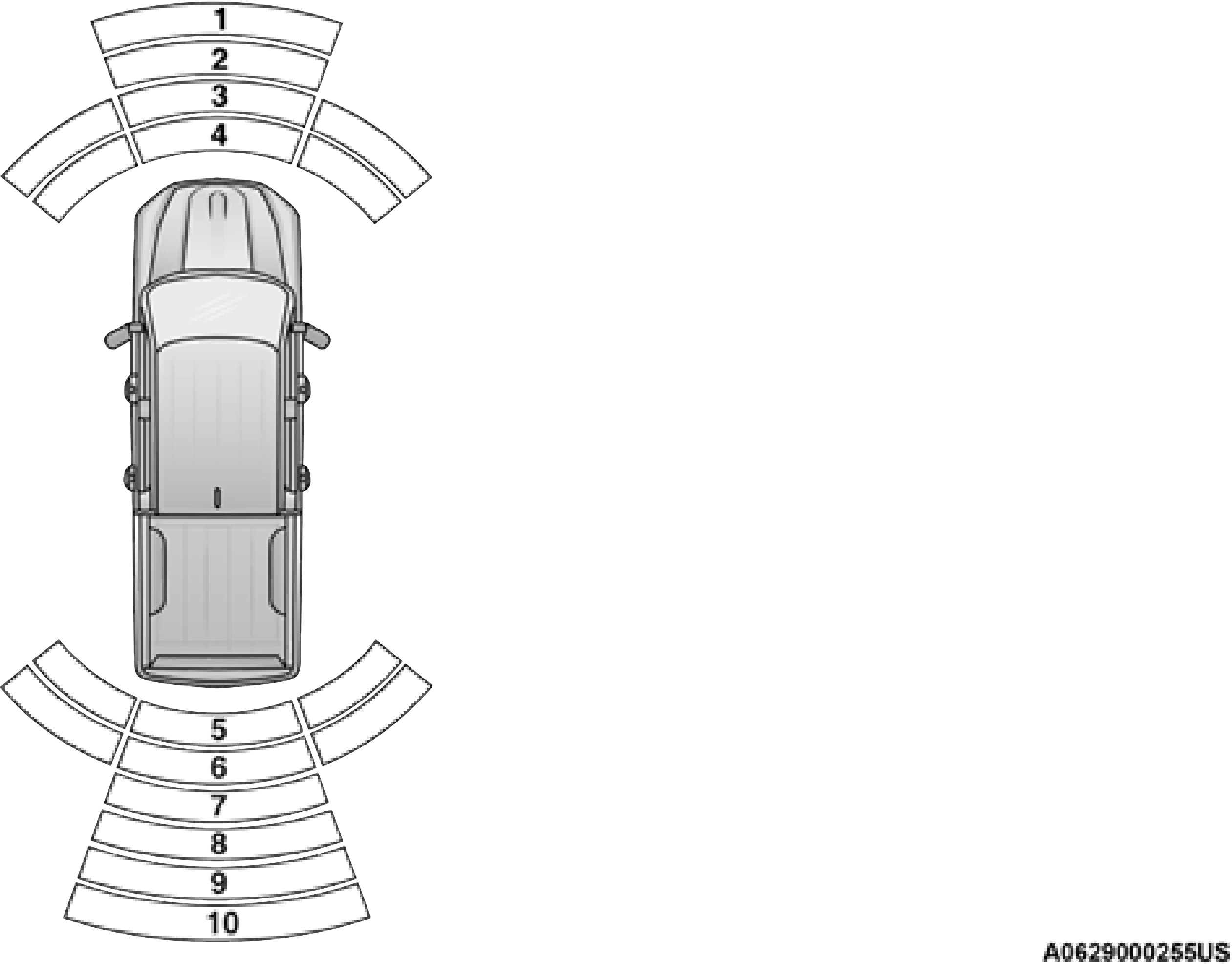 The system will indicate a detected obstacle by showing a single arc in the left and/or right rear regions based on the obstacle’s distance and location relative to the vehicle.