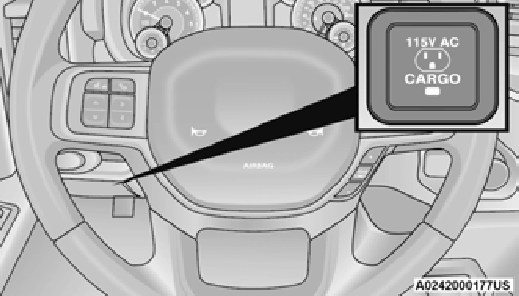 If equipped, a 115 Volt (400 Watts Maximum) inverter may be located inside the RamBox of your vehicle. The inverter can be turned on by the Instrument Panel Power Inverter switch located to the left of the steering wheel. The RamBox inverter can power cellular phones, electronics and other low power devices