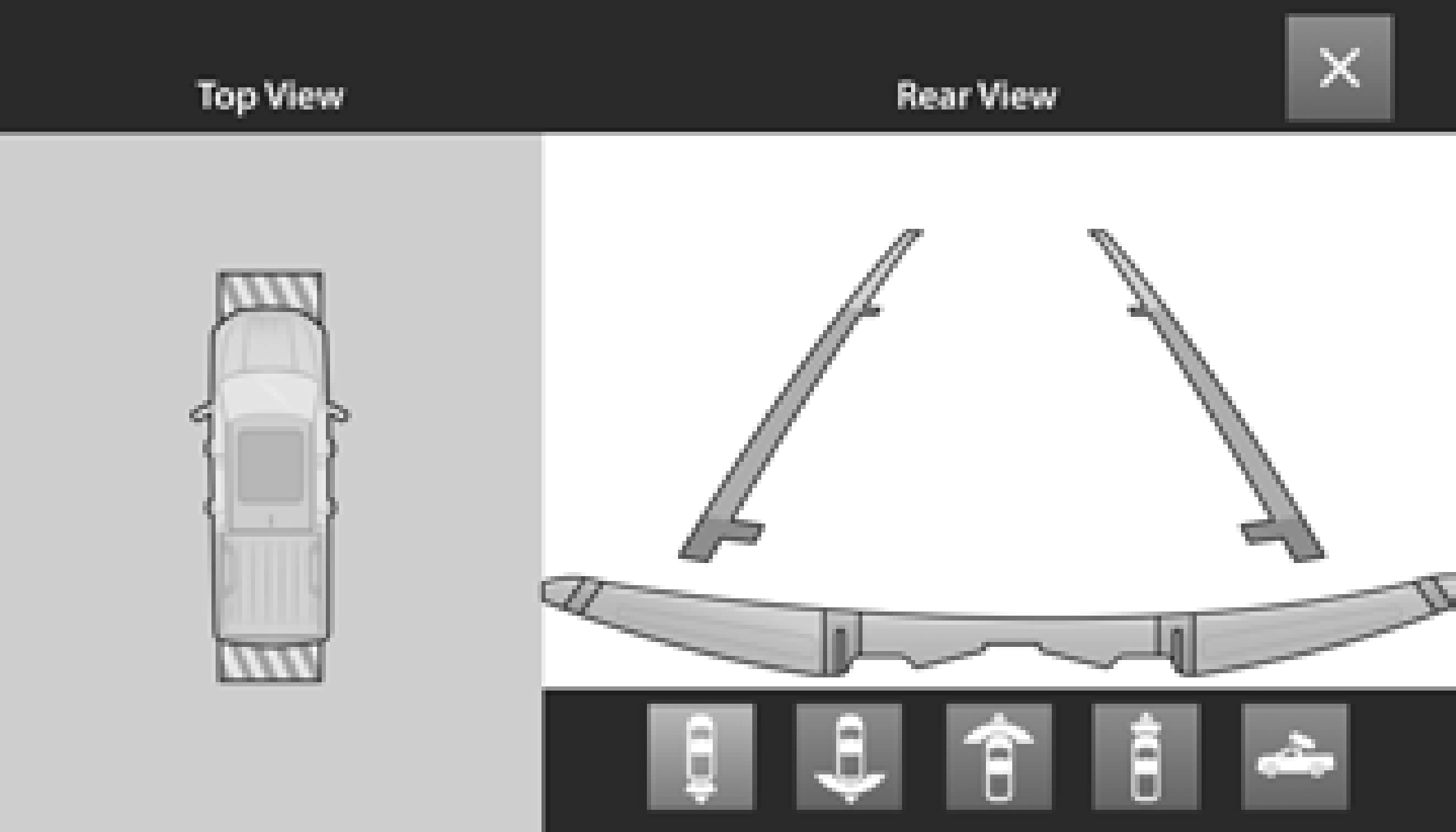 Pressing the Rear Cross Path soft key will give the driver a wider angle view of the rear camera system. The Top View will be disabled when this is selected.