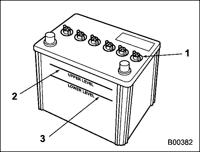 However, if the battery fluid level is below the lower level, remove the cap. Fill to the upper level with distilled water.