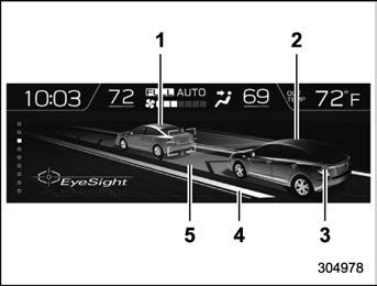 This screen displays the status of the EyeSight system. The lead vehicle indica- tor moves forward and backward depend- ing on the distance with the vehicle in front. For details, refer to the Owner’s Manual supplement for the EyeSight system.