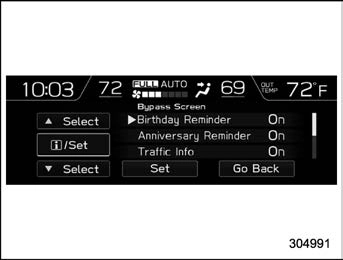 If a birthday or anniversary is approaching, a message will be displayed when the ignition switch is turned to the “ON” position. This function can be set to on or off. For details, refer to “Bypass screen setting” P221.