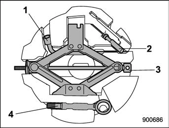 The jack, jack handle and towing hook are stored as shown in the following illustra- tions.