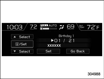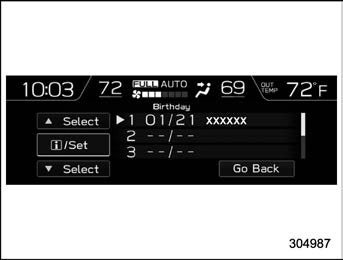 If a birthday or anniversary is approaching, a message will be displayed when the ignition switch is turned to the “ON” position. This function can be set to on or off. For details, refer to “Bypass screen setting” P224.