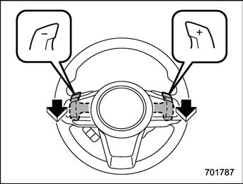 To upshift to the next higher gear position, pull the shift paddle that has “+” indicated on it. To downshift to the next lower gear position, pull the shift paddle that has “–” indicated on it.