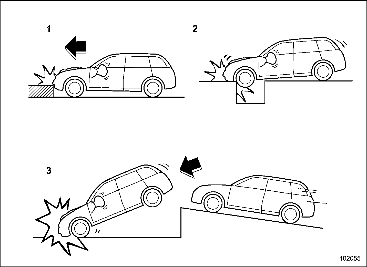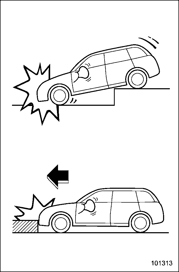 Only the driver’s SRS frontal airbag or both driver’s and front passenger’s SRS frontal airbags may be activated when the vehicle sustains a hard impact in the undercar- riage area from the road surface (such as when the vehicle plunges into a deep ditch, is severely impacted or knocked hard against an obstacle on the road such as a curb).