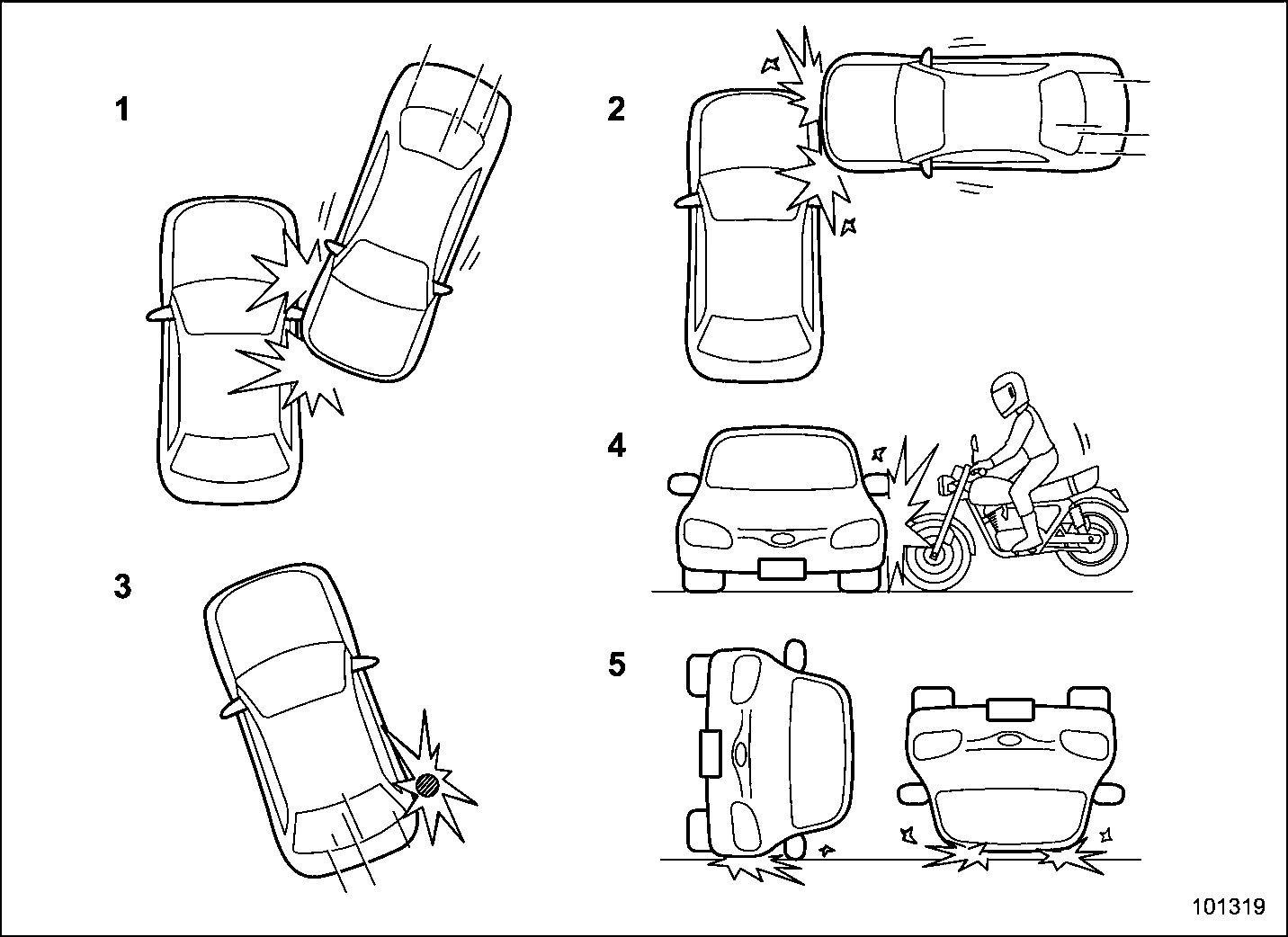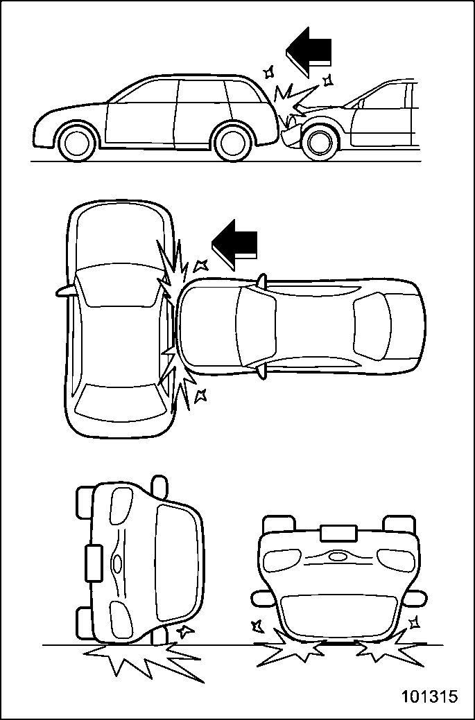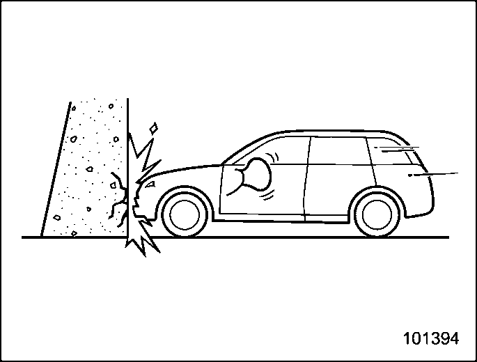 The vehicle strikes an object, such as a telephone pole or sign pole.There are many types of collisions which might not necessarily require deployment of driver’s/driver’s and front passenger’s SRS frontal airbag(s). In the event of accidents like those illustrated, the dri- ver’s/driver’s and front passenger’s SRS frontal airbag(s) may not deploy depend- ing on the level of accident forces involved.