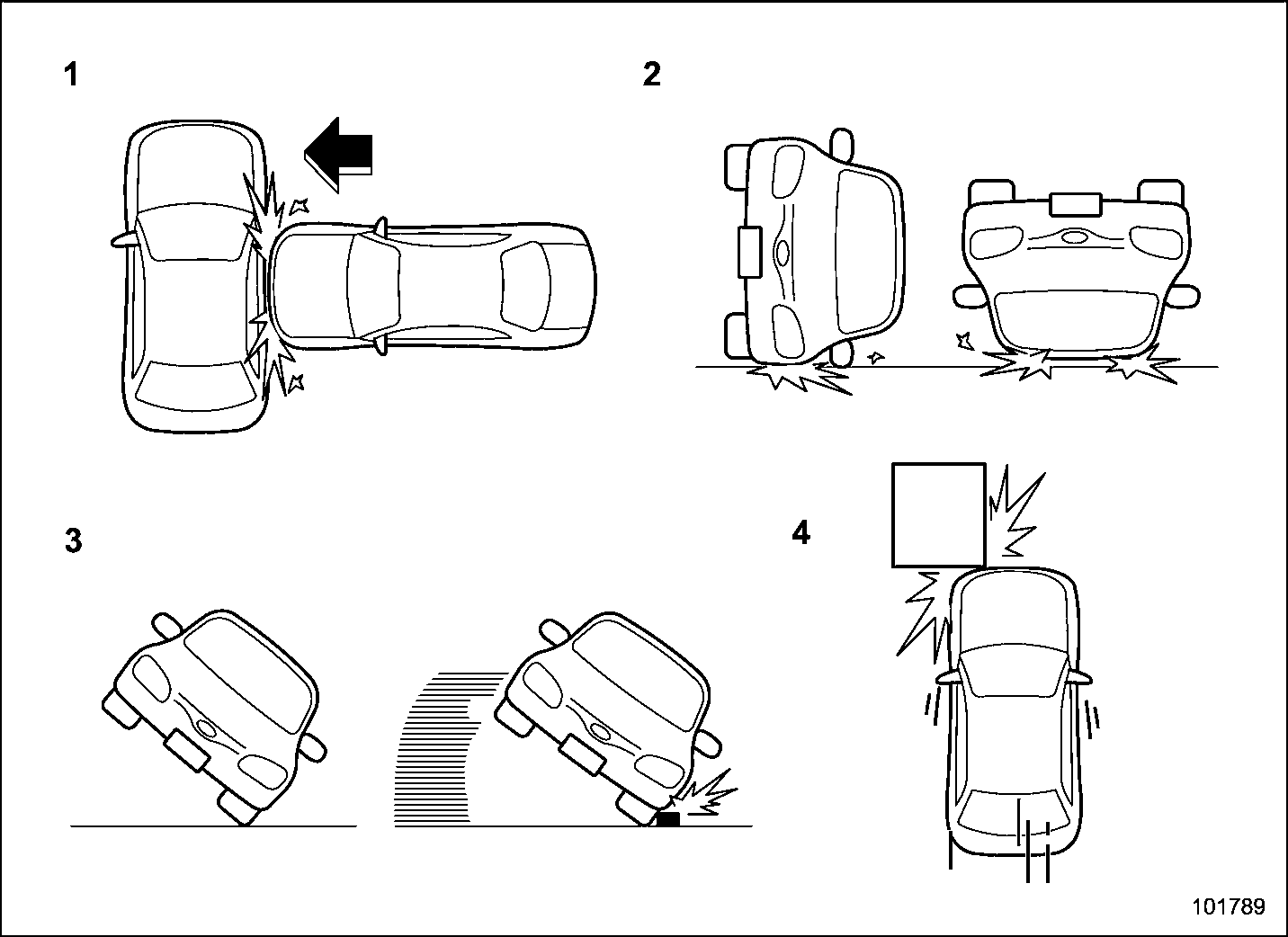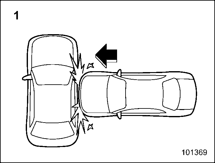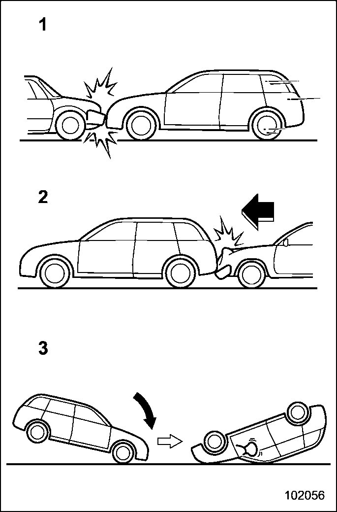 The vehicle is involved in an oblique side- on impact.There are many types of collisions which might not necessarily require SRS curtain airbag deployment. In the event of acci- dents like those illustrated, the SRS curtain airbag may not deploy depending on the level of accident forces involved.