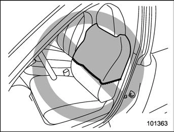 In a moderate to severe side impact collision, the SRS side airbag on the impacted side of the vehicle deploys between the occupant and the door panel and supplements the seatbelt by reducing the impact on the occupant’s chest and waist. The SRS side airbag operates only