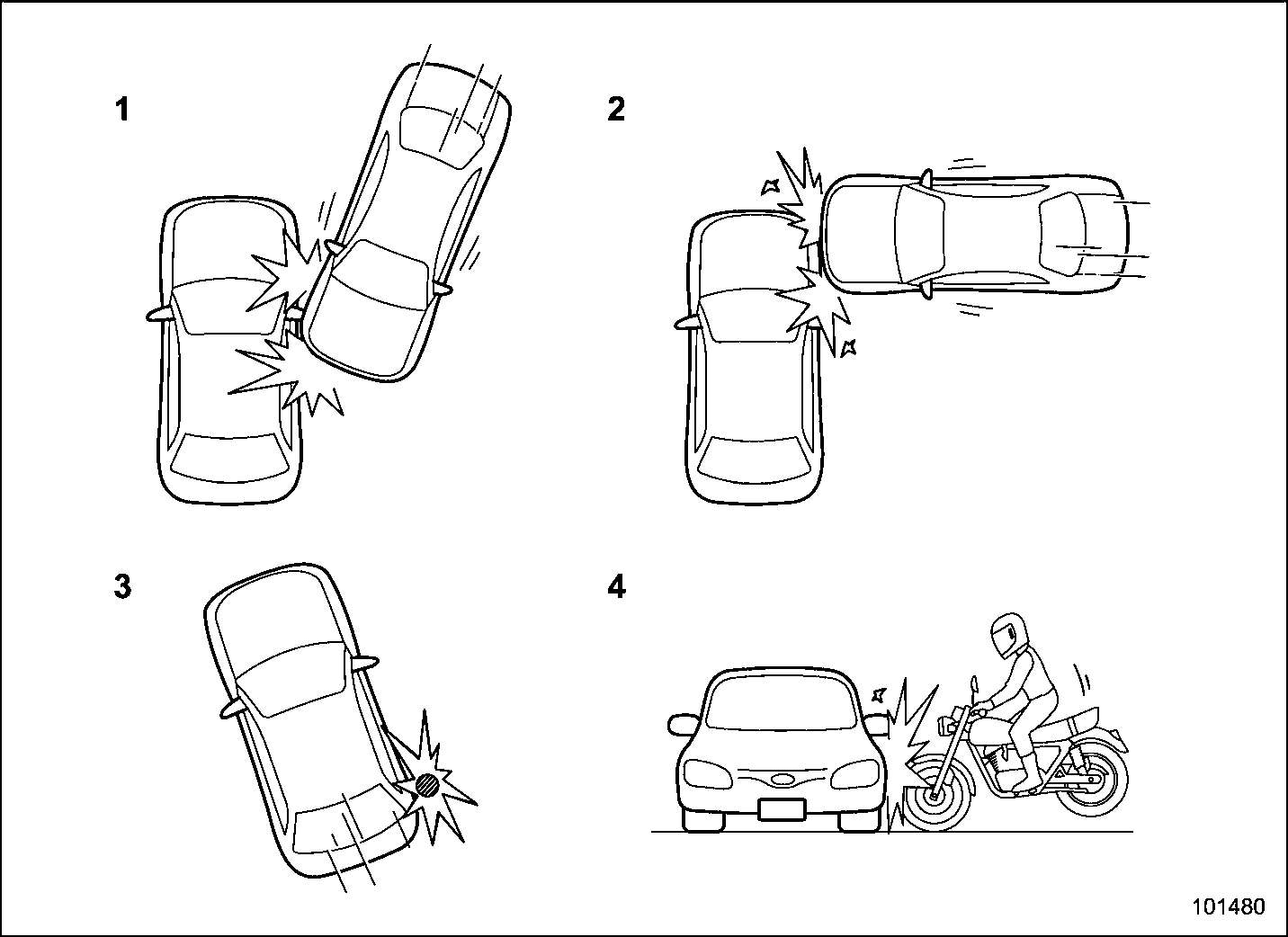 The vehicle is involved in an oblique side- on impact.There are many types of collisions which might not necessarily require SRS side airbag deployment. In the event of acci- dents like those illustrated, the SRS side airbag may not deploy depending on the level of accident forces involved.