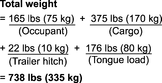 plus cargo weighing 375 lbs (170 kg). In addition, the vehicle is fitted with a trailer hitch weighing 22 lbs (10 kg), to which is attached a trailer weighing 1,764 lbs (800 kg). 10% of the trailer weight is applied to the