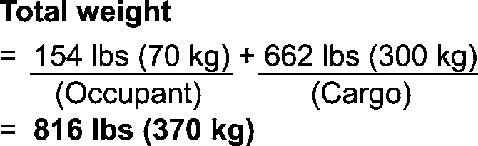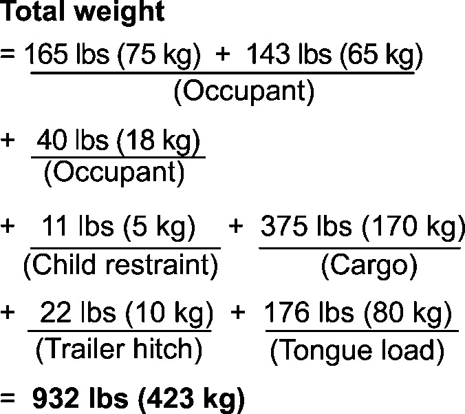 For example, if a person weighing 143 lbs (65 kg) and a child weighing 40 lbs (18 kg) now enter the same vehicle (bringing the number of occupants to three), and a child restraint system weighing 11 lbs (5 kg) is installed in the vehicle for the child to use, the calculations are as follows.