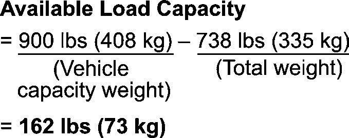 The total load capacity includes the total weight of driver and all pas- sengers and their belongings, any cargo, any optional equipment such as a trailer hitch, roof rack or bike carrier, etc., and the tongue load of a trailer. Therefore cargo capacity can be calculated by the following method.