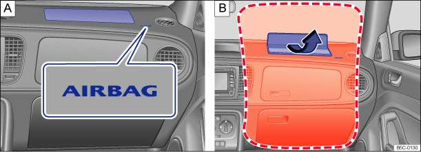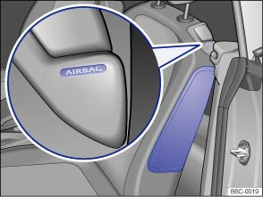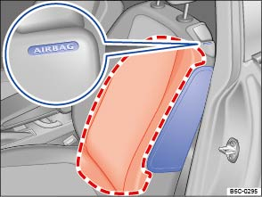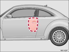 For Beetle Coupe models, the side airbags are in the backrest padding of the driver and front passenger seats . The general location is shown by the word AIRBAG. The area marked in red (dotted lines) indicates the deployment zone of the side airbags.