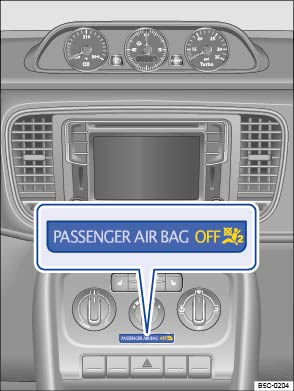 Fig. 27 In the instrument panel: PASSENGER AIR BAG light.