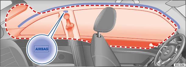 In Beetle Coupe models only, the Side Curtain Protection® airbags are in the header area on both sides of the vehicle . The general location is identified by the word AIRBAG. The red lines show the deployment zone of the Side Curtain Protection® airbags. The Side Curtain Protection® airbags contain features that provide ejection mitigation to help prevent vehicle occupants or parts of their bodies from being completely or partially ejected from the vehicle interior in certain side impacts and vehicle rollovers.