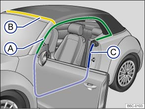 Fig. 139 Caring for rubber seals: Seals on the side windows Ⓐ, the roof seal Ⓑ, and door seals Ⓒ.