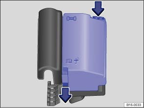 - Press the release tabs in the direction of the arrows to unlock the fuse box cover.